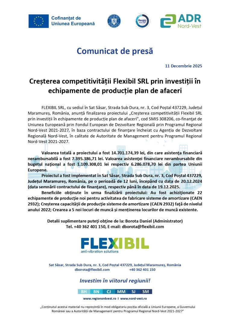 COMUNICAT DE PRESĂ. Creșterea competitivității Flexibil SRL prin investiții în echipamente de producție plan de afaceri