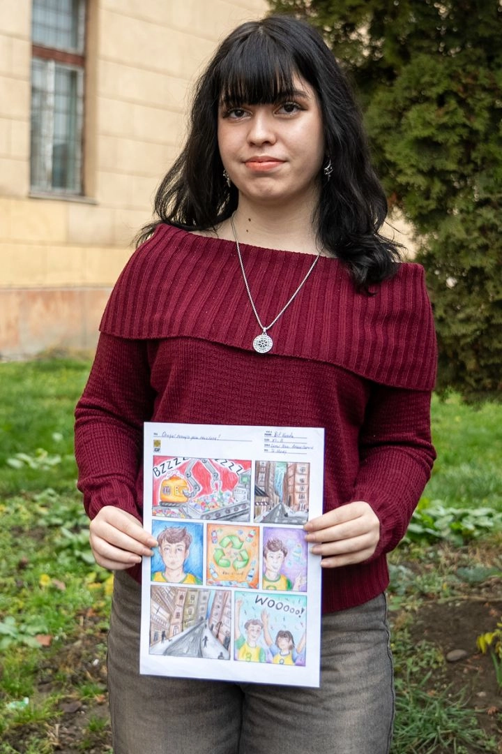 Teodora Ciocu (C.N. „Dimitrie Cantemir” Onești) spune că tema concursului a fost „bine aleasă”, într-un moment în care reciclarea este „o problemă profundă, care trebuie rezolvată cât mai repede și definitiv”. Prin lucrarea sa, Teodora a încercat să facă oamenii să zăbovească „preț de câteva clipe asupra foii albe…sau vii, pline de imagini” și să conștientizeze gravitatea problemei.